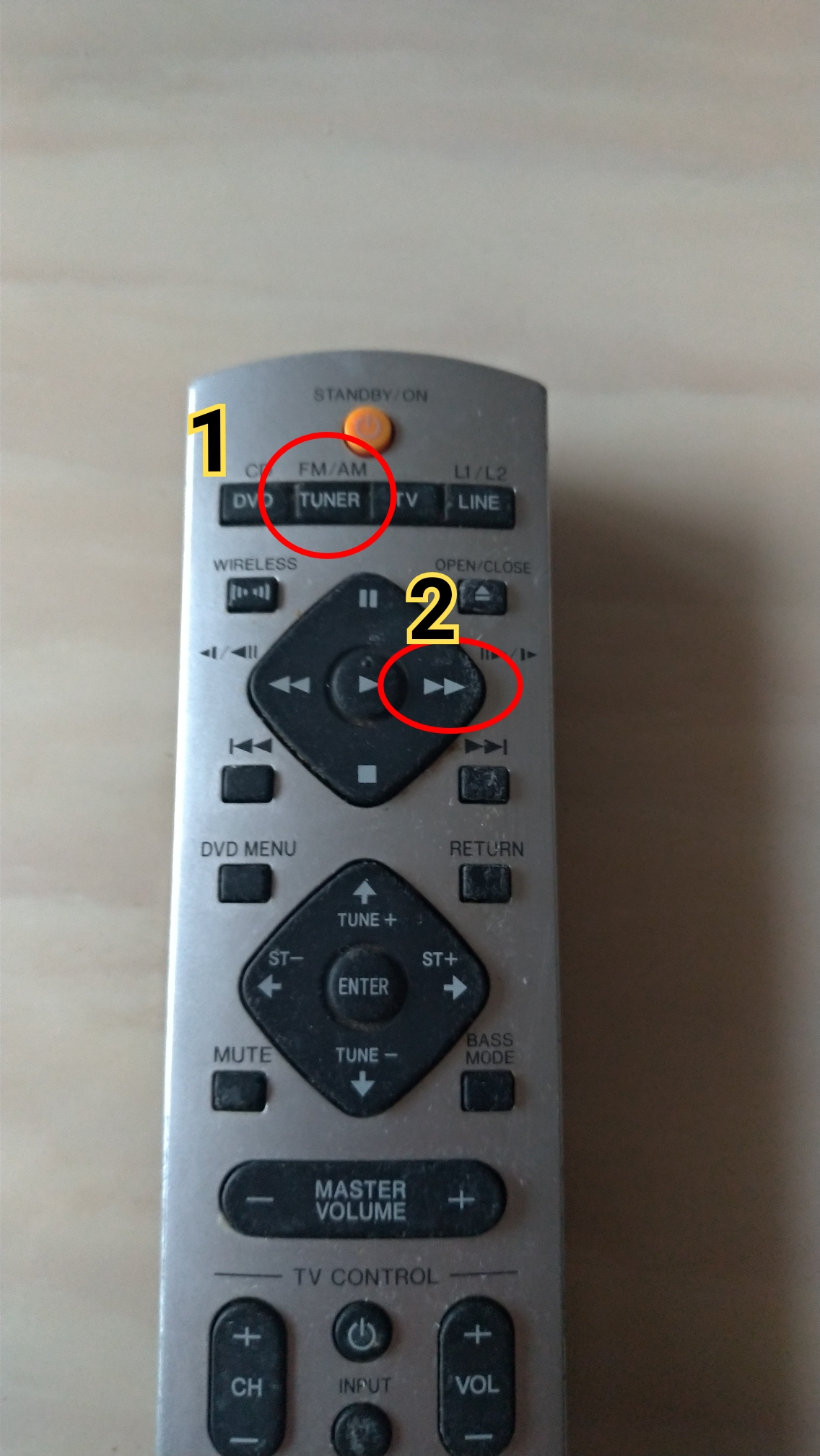 Posted in 一般日誌 Pioneer xv-dv535 FM電台記憶設定備忘。 Author: 蔡玉貴(friber) Published Date: 2021 年 1 月 27 日 Pioneer xv-dv535 這台音響年份是2005年,至今約16年,紀錄FM電台記憶設定方式以備忘。 首先遙控器選TUNER 按右雙箭頭改變頻道頻率,選定所要的頻道,推開下方滑蓋,移到SUB,再選SYSTEM SETUP,查看主機面版,直到出現St.Mem?按Enter兩次即可完成電台記憶。 Author: 蔡玉貴(friber)