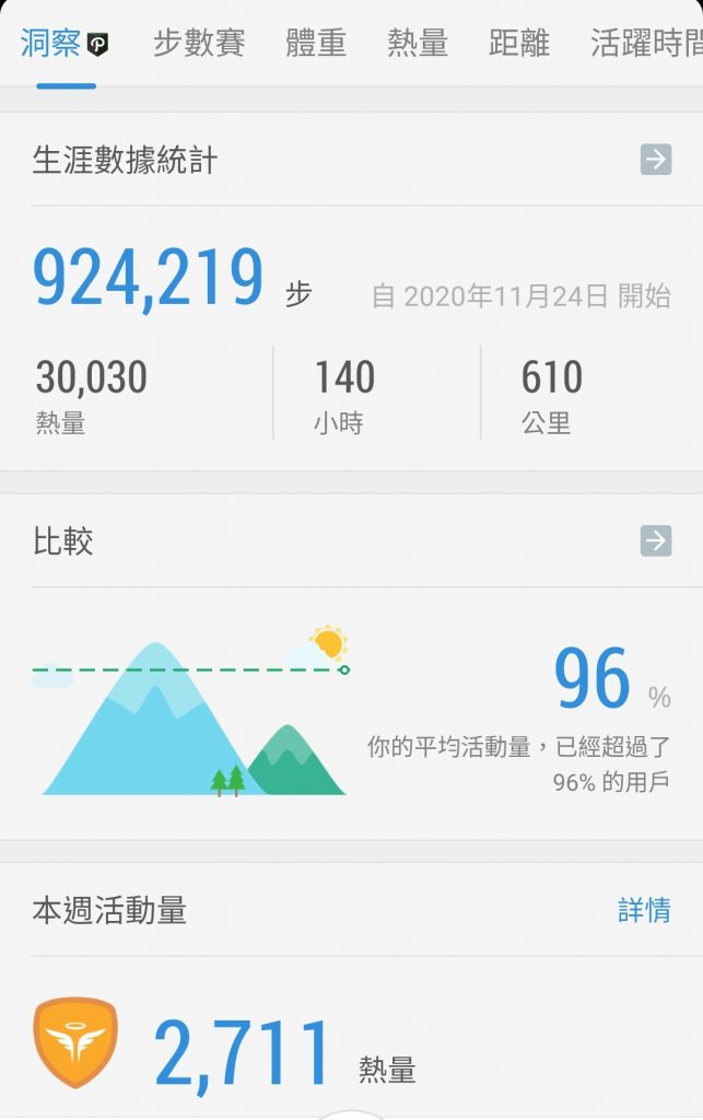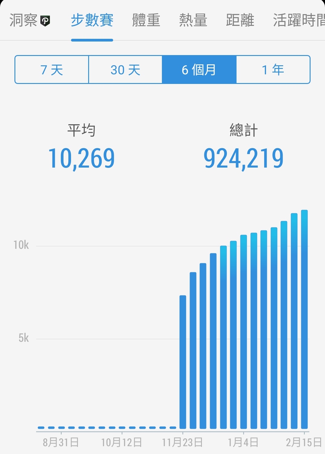 Posted in 一般日誌 第三個30天步行成果紀錄(110/01/22-02/21) Author: 蔡玉貴(friber) Published Date: 2021 年 2 月 21 日 第三個30天步行成果紀錄(110/01/22-02/21) 6個月平均步數:10269 30天平均步數:11468 7天平均步數:11940 平均活動量超過96%的用戶 自12/30起每日皆步行萬步,且步數今日必多於昨日,今日步行數12017。 這次30天步行紀錄恰逢春節年假,走春路線避開人潮,走得更為愜意。空品差或不想出門時,就在家騎磁浮腳踏車,同樣達到日行萬步的目的。 Author: 蔡玉貴(friber)
