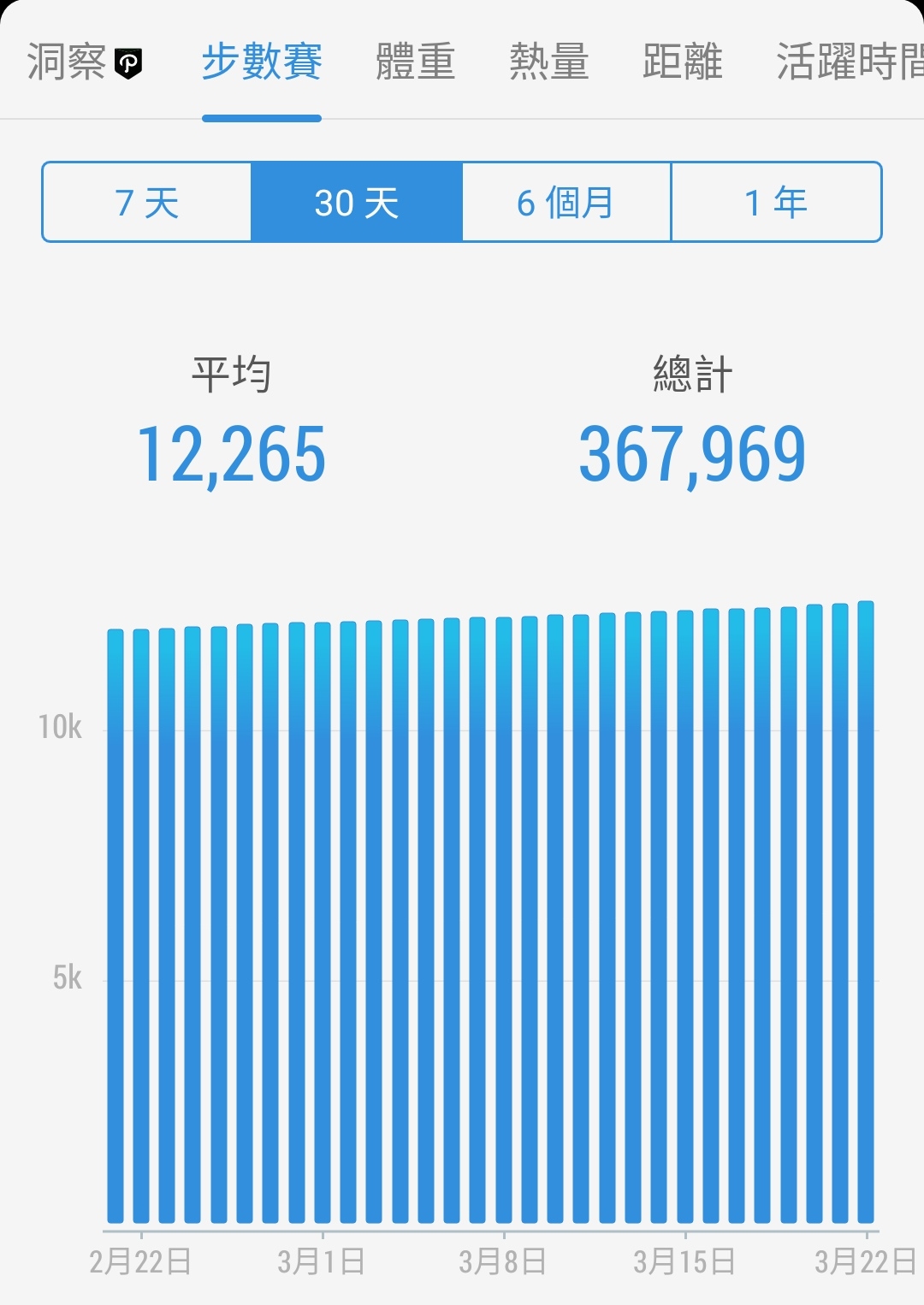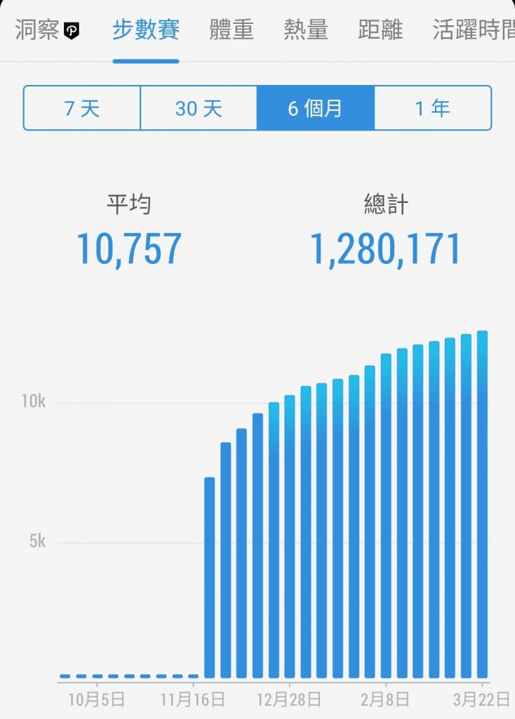 Posted in 一般日誌 第四個30天步行成果紀錄(110/02/21-03/22) Author: 蔡玉貴(friber) Published Date: 2021 年 3 月 22 日 第四個30天步行成果紀錄(110/02/21-03/22) 6個月平均步數:10757 30天平均步數:12265 7天平均步數:12479 平均活動量超過96%的用戶 第四個步數仍維持今日必多於昨日,今日步行數12575。 很穩定、很漂亮的步行數字圖。 第四個30天步數統計圖 第三個30天步數統計圖 第二個30天步數統計圖 第一個30天步數統計圖 Author: 蔡玉貴(friber)