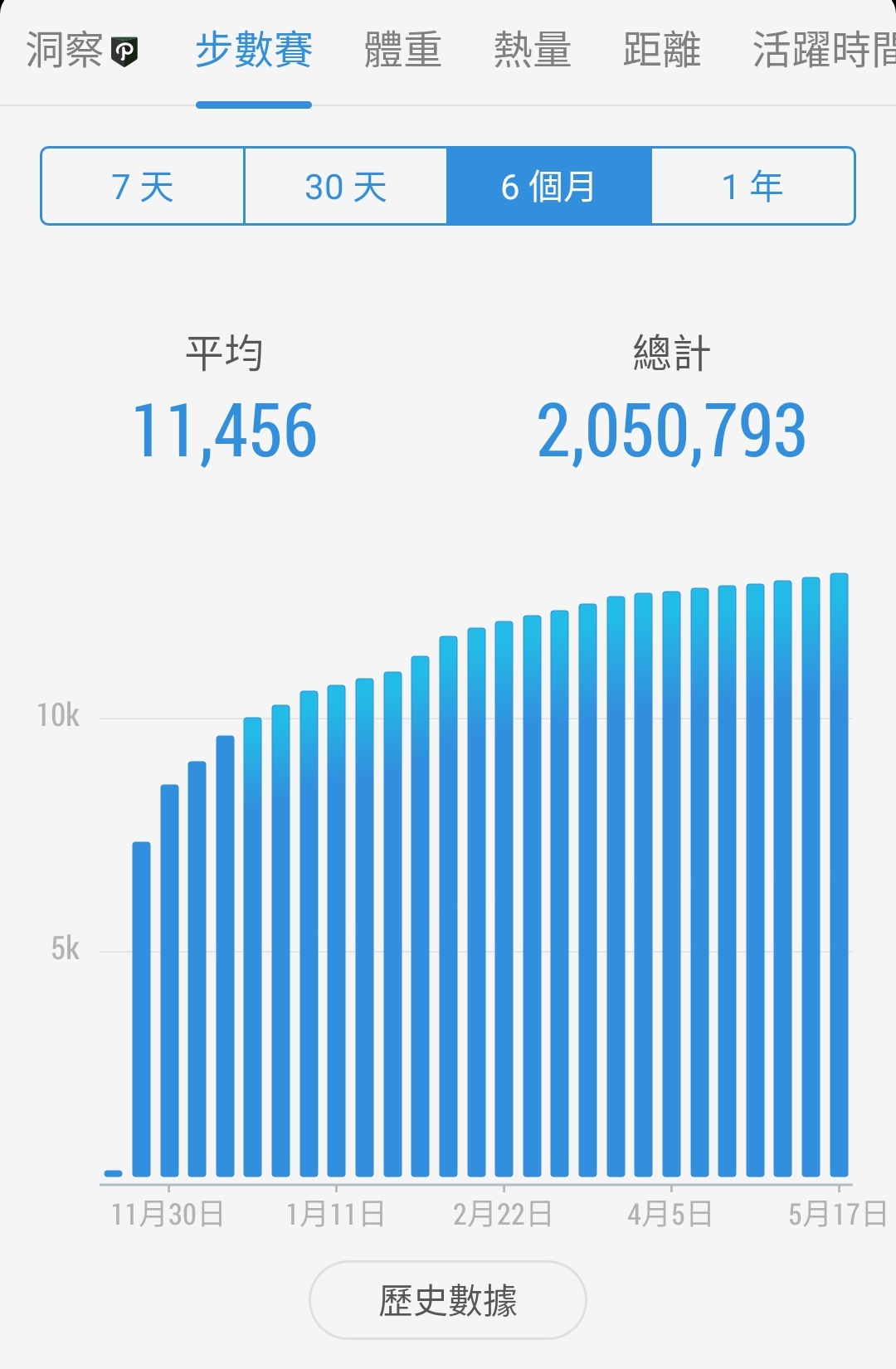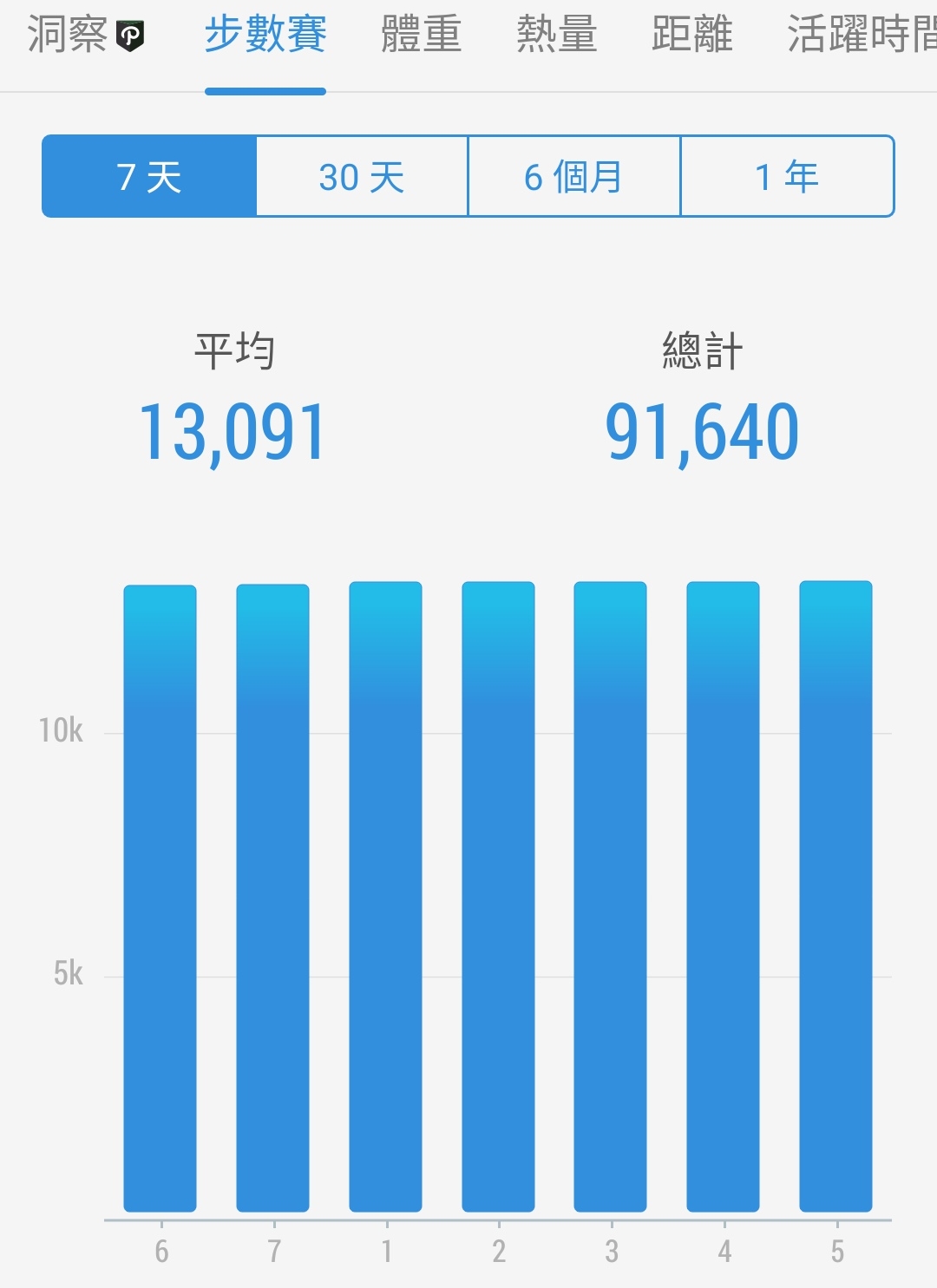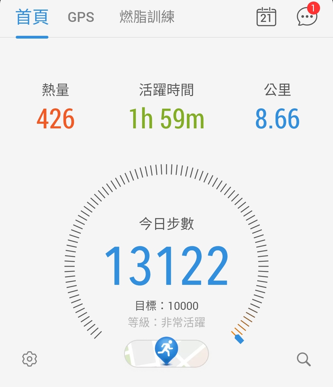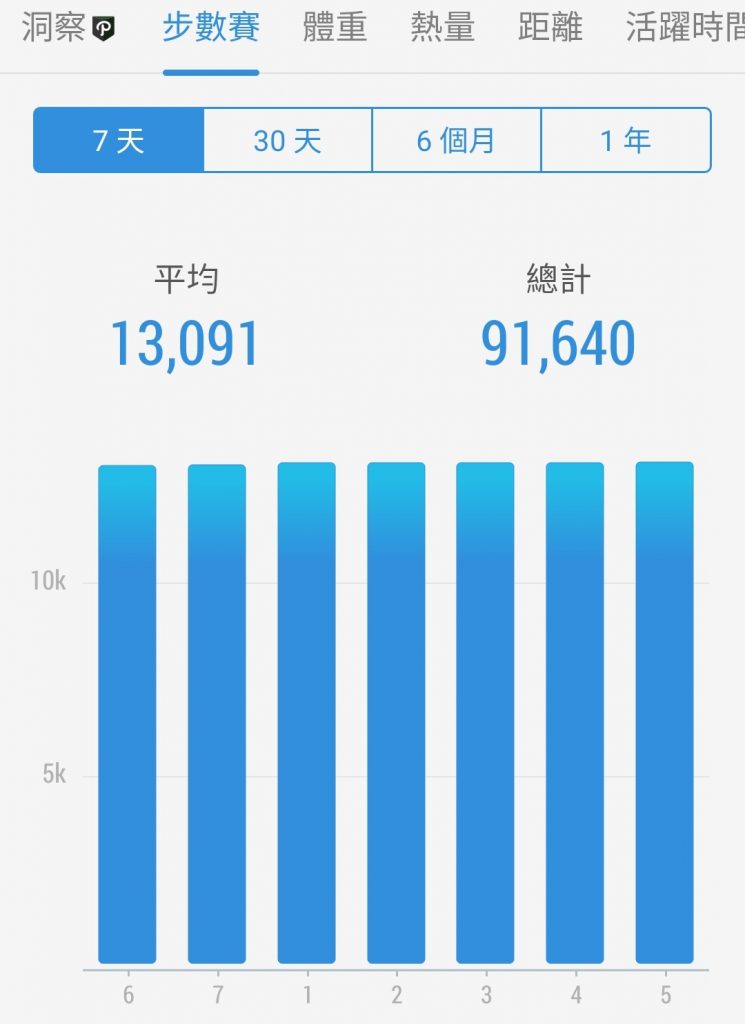 Posted in 一般日誌 第六個30天步行成果紀錄(110/04/22-05/21) Author: 蔡玉貴(friber) Published Date: 2021 年 5 月 21 日 第六個30天步行成果紀錄(110/04/22-05/21) 6個月平均步數:11456 30天平均步數:12967 7天平均步數:13091 平均活動量超過97%的用戶 第六個30天步行步數仍維持今日必多於昨日之數,5個月來一直達成自定之目標,今日步行數13122。 持續穩定、漂亮的步行數字圖。 第六個30天步數統計圖 第五個30天步數統計圖 第四個30天步數統計圖 第三個30天步數統計圖 第二個30天步數統計圖 第一個30天步數統計圖 Author: 蔡玉貴(friber)