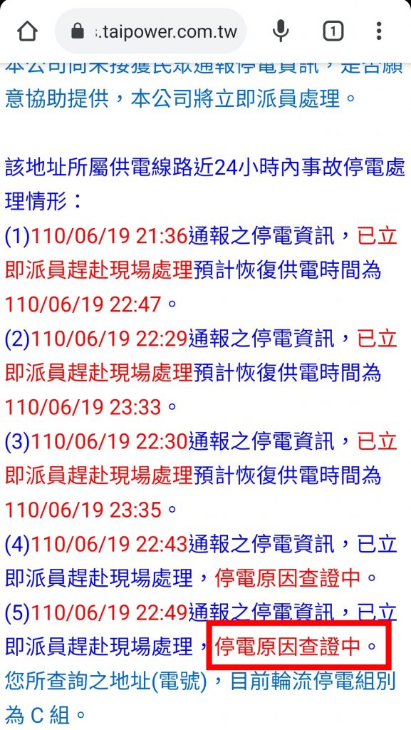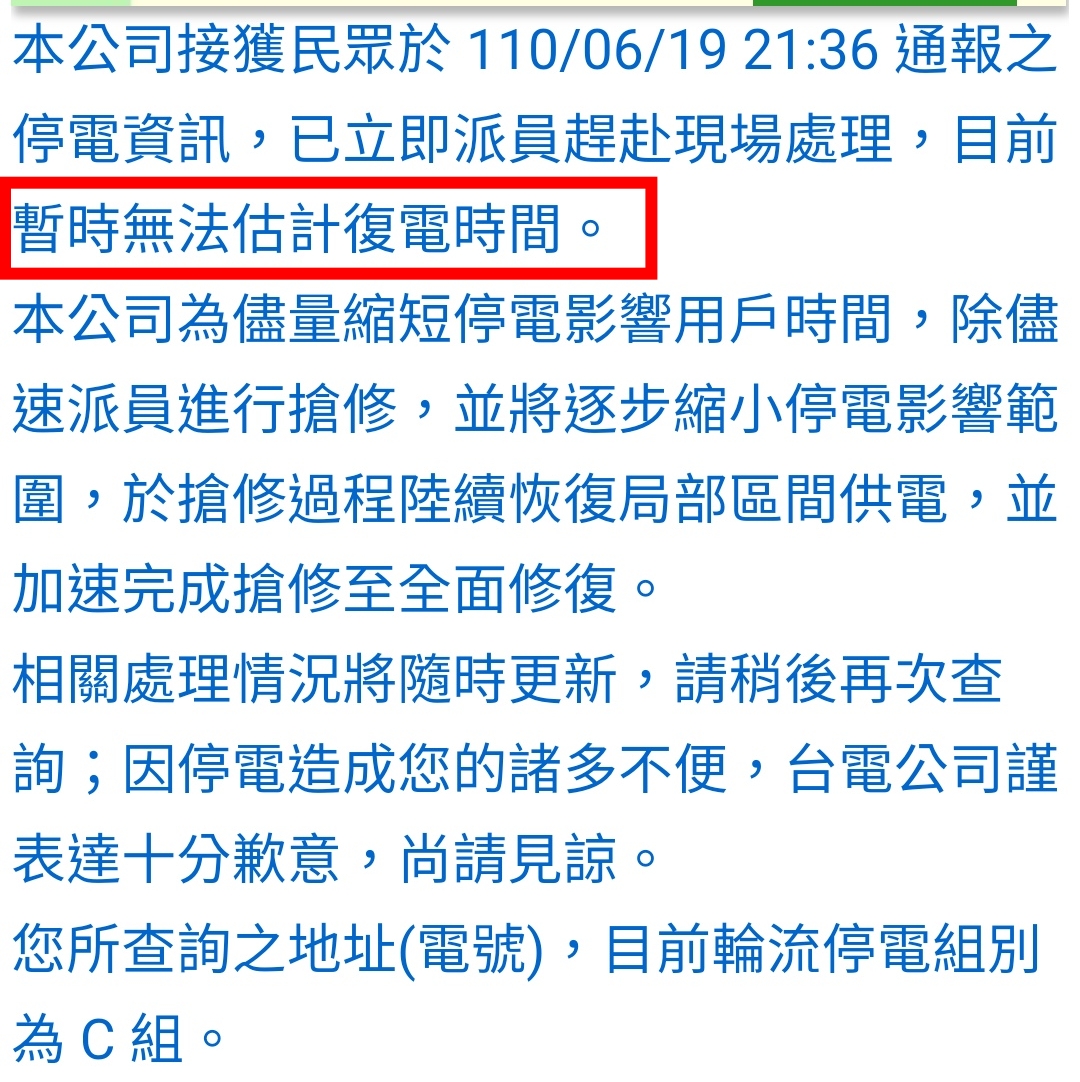 Posted in 一般日誌 6/19晚10點19分無預警停電 Author: 蔡玉貴(friber) Published Date: 2021 年 6 月 20 日 6/19晚10點19分無預警停電 6/19晚10點19分無預警停電,至今原因不明,以下是台電查詢之訊息。 再次查詢結果: 這次停電時間前後大約2個小時,冰箱內食材多少會有影響,家裡行動電源Enerpad AC-54K連續輸出功率可達200W,冰箱約130W,雖可供冰箱使用,但半夜睡覺電風扇還是更需要些。備援電力有限下還是得取捨,好眠更重要。幸好,平日幾乎不開冷氣,否則習慣冷氣伴眠,突然停電就難以好眠了。 Author: 蔡玉貴(friber)