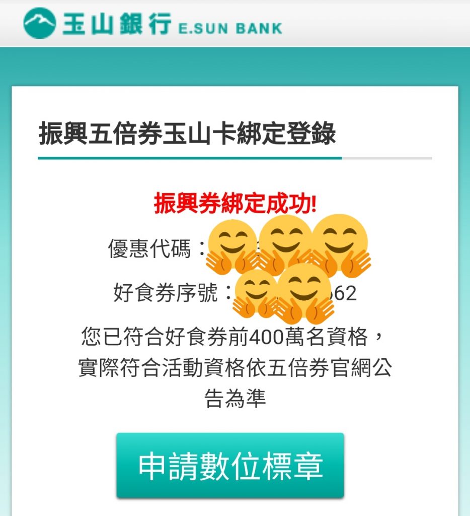 已成功綁定,也符合好食券資格,依據序號,應是前70多萬名成功者。