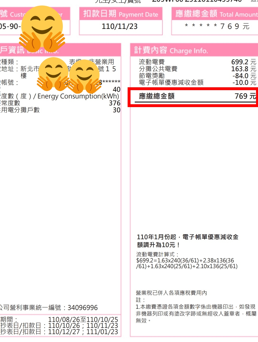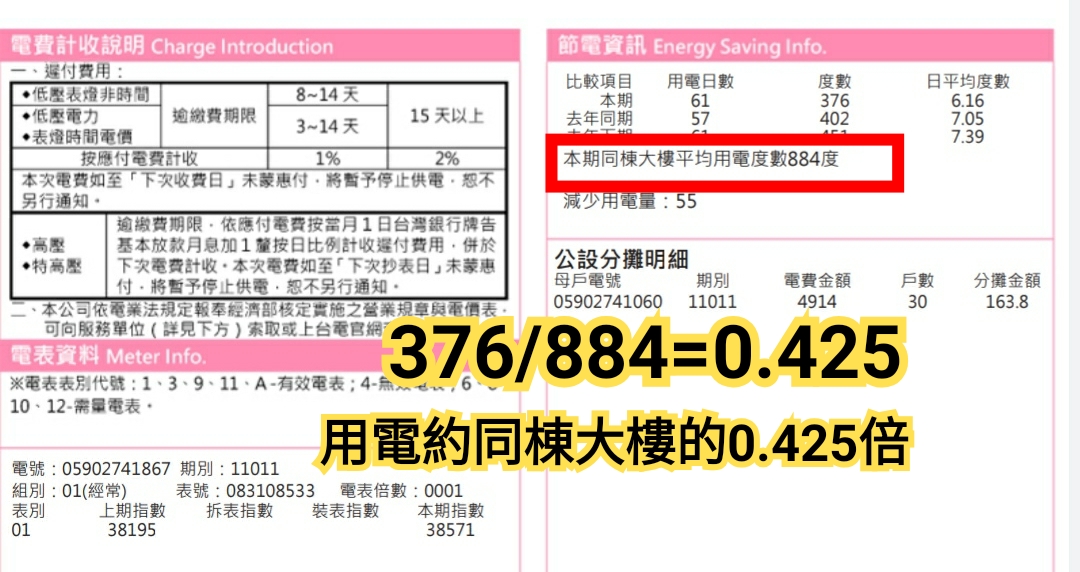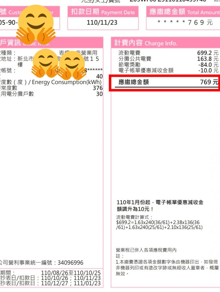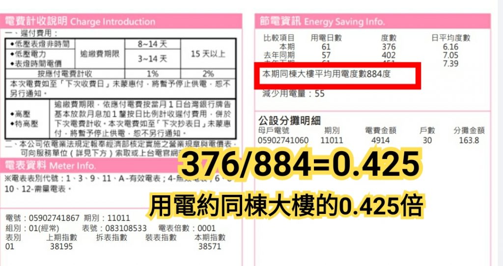 Posted in 一般日誌 110/11 電子帳單電費通知 Author: 蔡玉貴(friber) Published Date: 2021 年 11 月 1 日 110/11 電子帳單電費通知 11月電費:769元 計費期間2021/08/26-2021/10/25 平均每日用電:6.16度 本期用電約是同棟大樓的0.425倍(376/884),不到一半,約4.3成。 Author: 蔡玉貴(friber)