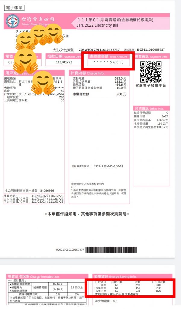 Posted in 一般日誌 111/01 電子帳單電費通知 Author: 蔡玉貴(friber) Published Date: 2022 年 1 月 3 日 111/01 電子帳單電費通知 111/ 01 電子帳單電費通知 1月電費:560元 計費期間2021/10/26-2021/12/26 這期電費少於去年同期不少,平均每日用電4.81度,去年每日是7.39度,每日減少2.58度。 主因應是汰換舊冰箱,改用一級節電的環保冰箱所致。此外,今年尚未使用電暖器,因此就更省了一些。 Author: 蔡玉貴(friber)