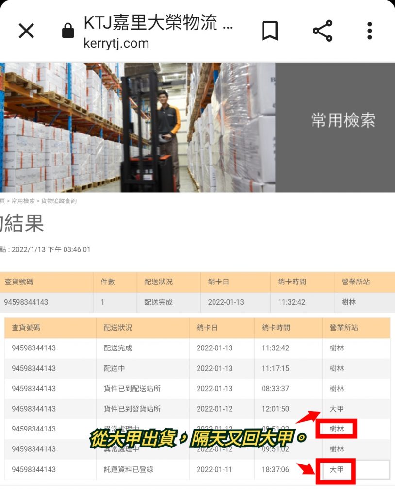 線上訂了一張椅子,遇到了很特別的出貨流程。1/11由嘉里大榮大甲出貨,1/12上午9:51到樹林站,不知何故中午12:01又回到大甲,隔一天1/13再度回到樹林。