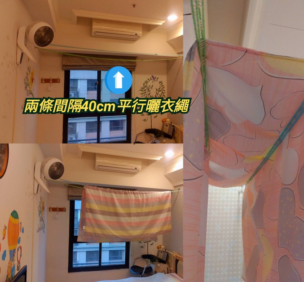Posted in 一般日誌 ㄇ字型曬衣架 Author: 蔡玉貴(friber) Published Date: 2022 年 1 月 20 日 ㄇ字型曬衣架 書房新增4個掛勾,除可掛衣帽、背包,掛上兩條曬衣繩就成了實用的空中曬衣架。 兩條間隔40公分的曬衣繩,可增加對流與曬衣面積,加上除溼機,即使是被單、床罩也能很快風乾。 對處於溼冷冬季的新北都會區,多半陽台空間都不大,動態增加曬衣等使用空間有其必要。 此四個掛勾,除了可做ㄇ字型曬衣架,也能當做掛蚊帳的支撐,雖然位處高樓,幾乎未見蚊子,備而不用也挺不錯的。 Author: 蔡玉貴(friber)