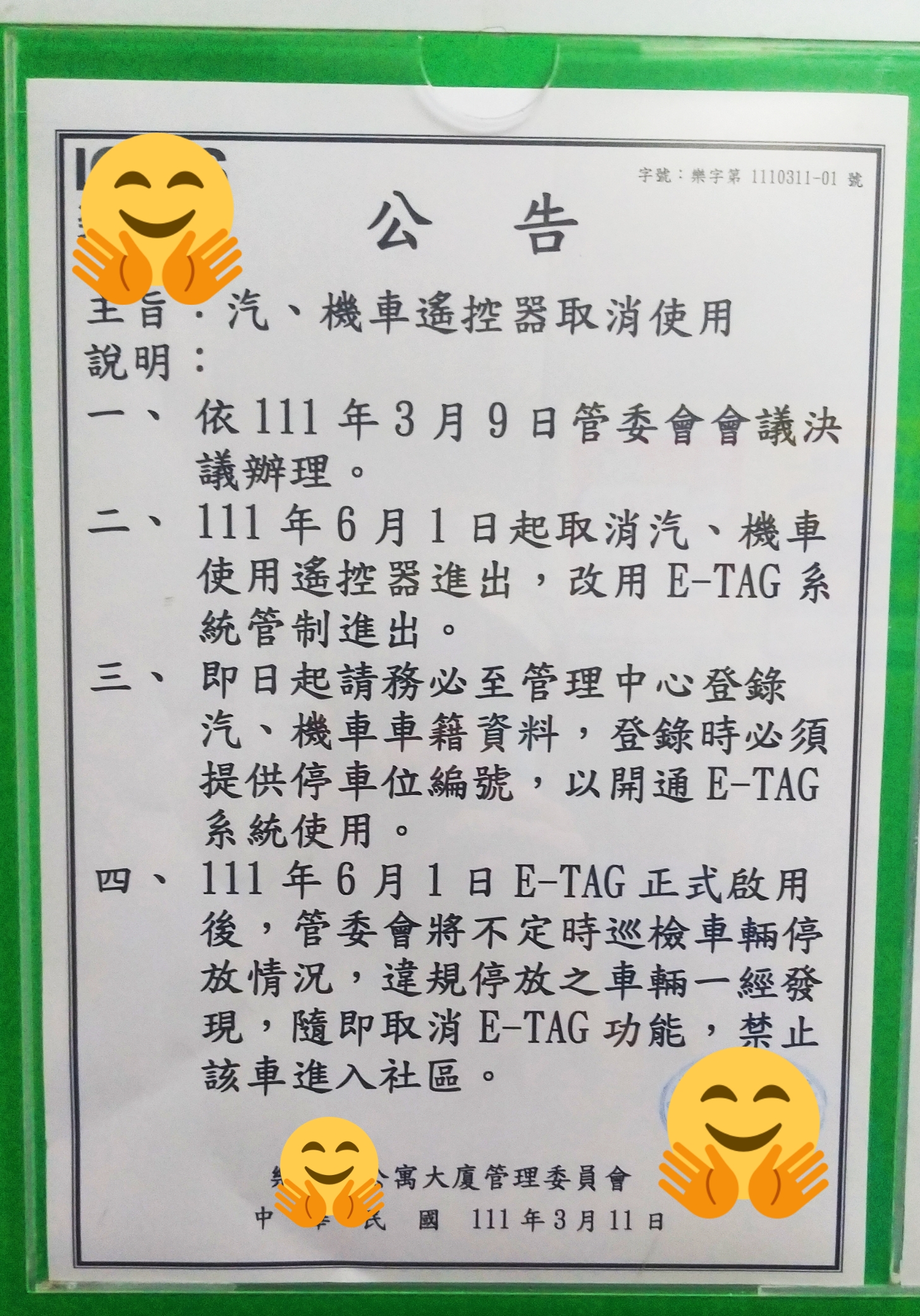 Posted in 一般日誌 社區停車場進出自111/06/01起取消遙控器使用 Author: 蔡玉貴(friber) Published Date: 2022 年 3 月 12 日 社區停車場進出自111/06/01起取消遙控器使用,全部改用E-tag感應進出。 這系統已啟用一段時間,可說漸入佳境,感應位置與時間越來越令人滿意。毋須使用遙控器,感應後自動開啟閘門的確便利。 相關文章: 1/24起試用 社區汽機車進出管制改為E-tag Author: 蔡玉貴(friber)
