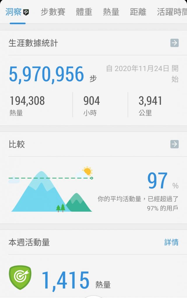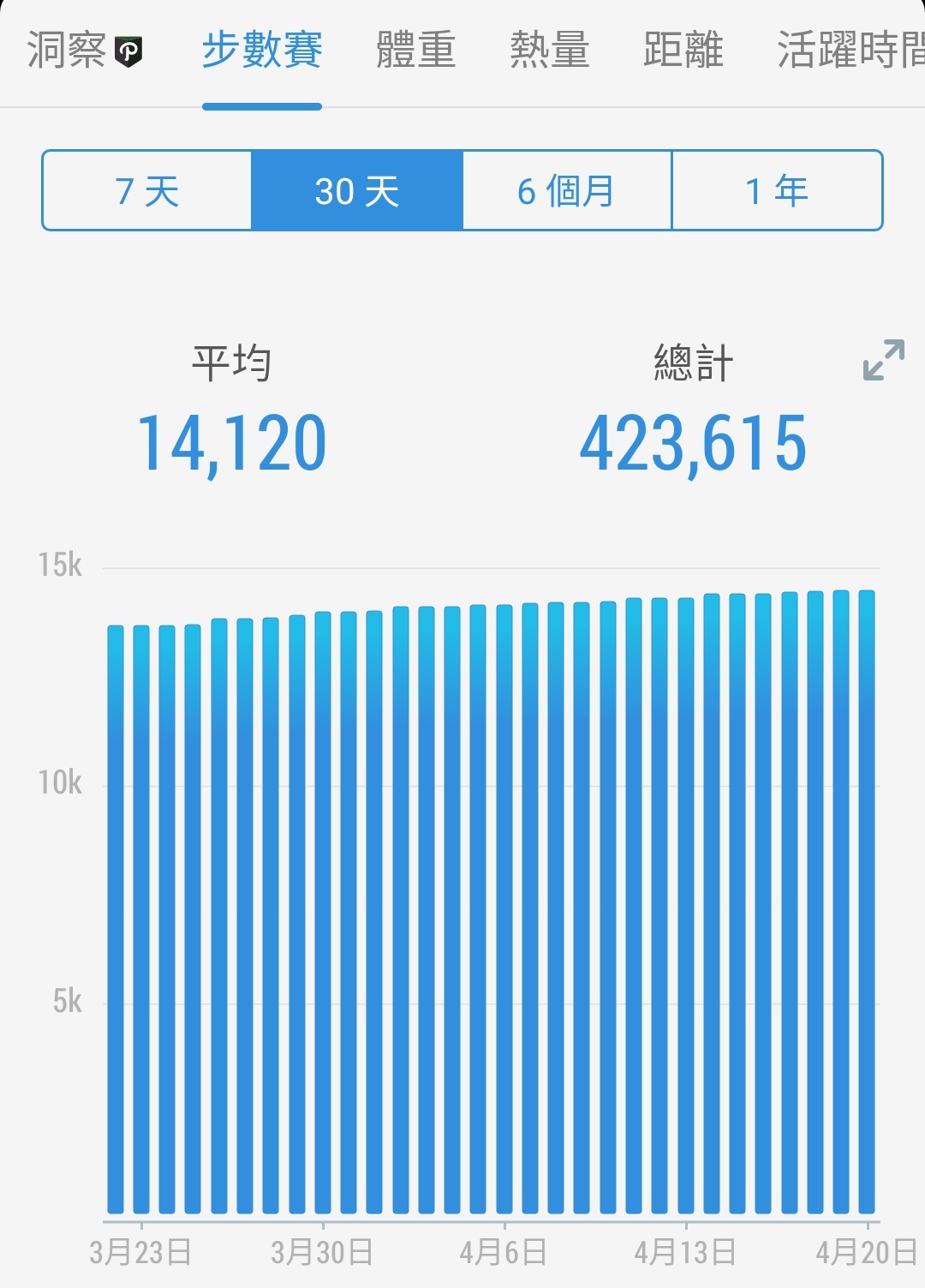 Posted in 一般日誌 第十七個30天步行成果紀錄(111/03/22-111/04/20) Author: 蔡玉貴(friber) Published Date: 2022 年 4 月 20 日 第十七個30天步行成果紀錄(111/03/22-111/04/20) 6個月平均步數:11888 30天平均步數:14120 7天平均步數:14439 平均活動量超過97%的用戶,累計步數:5970956 相關文章 第十六個30天步行成果紀錄(111/02/20-111/03/21) Author: 蔡玉貴(friber)
