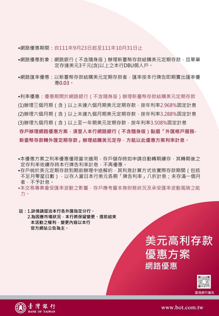 臺灣銀行美元高利存款優惠方案,111/09/23-111/10/31