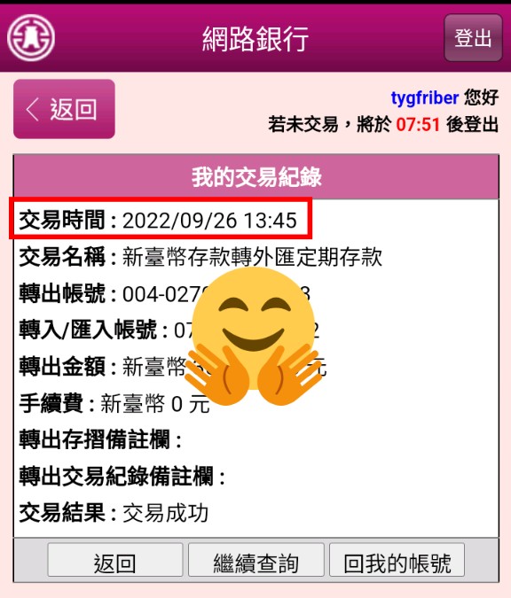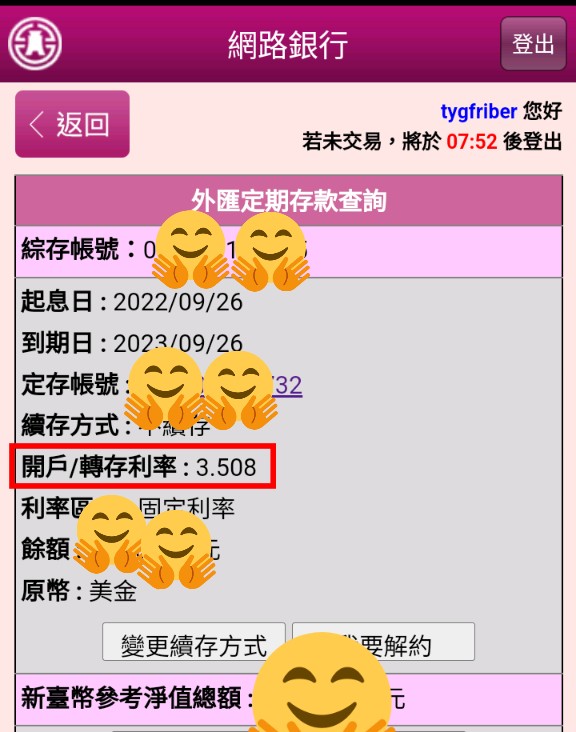 更有趣的是,我在尚未收到審核通過時,約13:15就發現app已顯示已新增外匯數位帳號,立刻用電腦登入測試,存戶辦理網路優惠方案,登入網路銀行後 (不含隨身版)點選「外匯帳戶服務-新臺幣存款轉外匯定期存款」辦理結購美元定存,果然成功完成此優惠方案,真是太妙了!