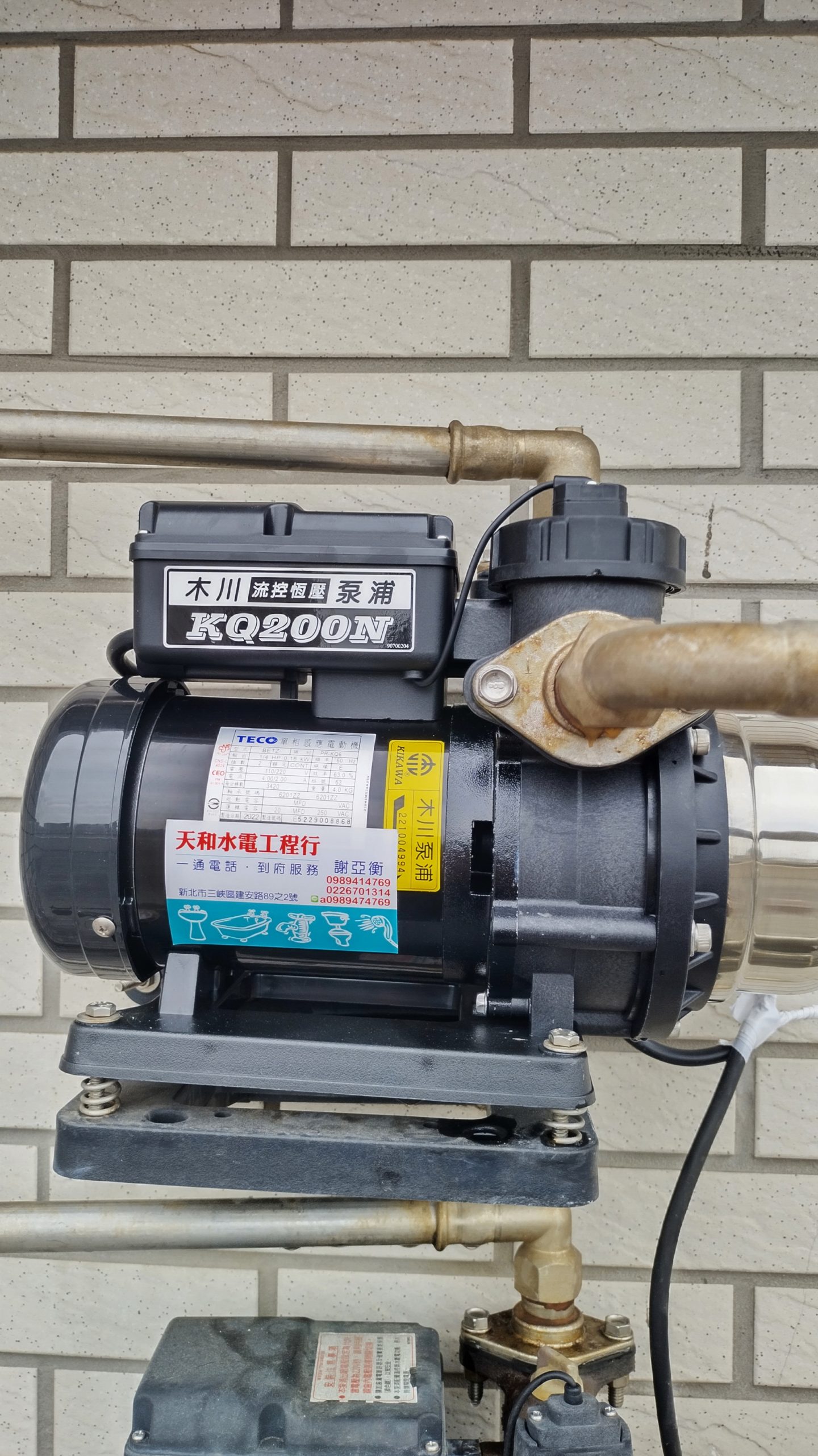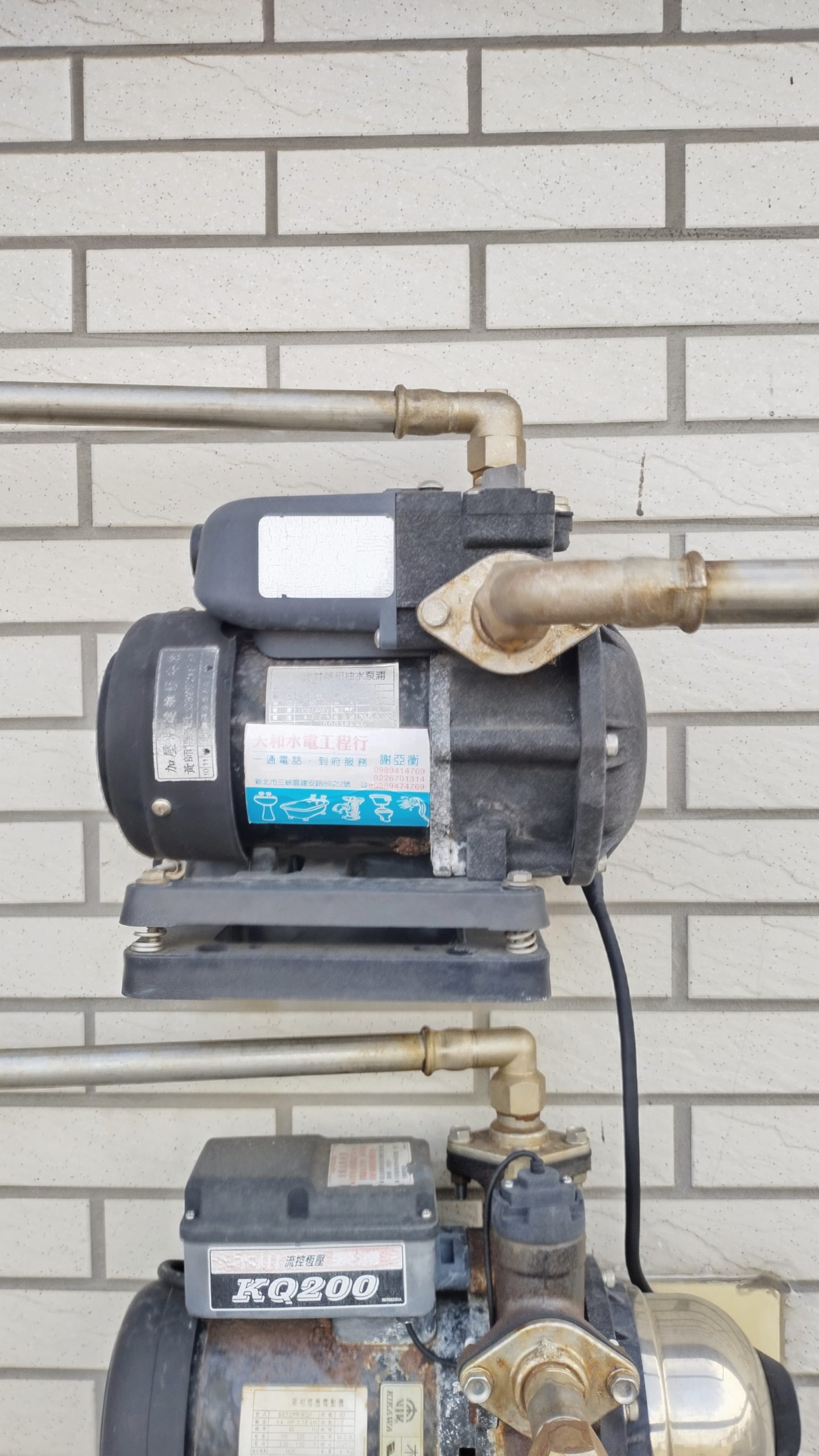 Posted in 一般日誌 更換大樓加壓馬達 Author: 蔡玉貴(friber) Published Date: 2023 年 2 月 20 日 更換大樓加壓馬達 更換加壓馬達-木川KQ200N 原加壓馬達已使用10年多,近期出現擾人噪音,一早去電聯繫原安裝廠商,恰好謝老闆人在附近大樓維修,不久就帶新馬達前來更換。 拆除舊機與更換新機大約30分鐘,雖馬達價格比起10年前貴了1倍,連工帶料6500,但換得清靜又不擾鄰真是非常值得。 舊機 新機 Author: 蔡玉貴(friber)