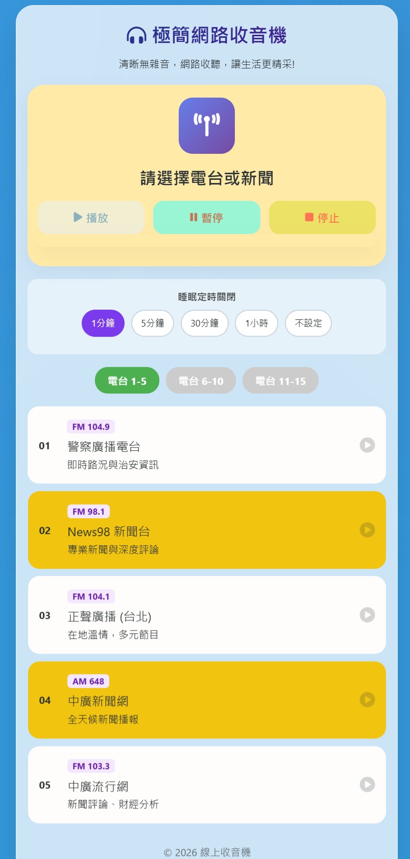 Posted in 一般日誌, 人工智慧 極簡網路收音機 Author: 蔡玉貴(friber) Published Date: 2026 年 1 月 25 日 近期完成了一款極簡網路收音機的應用,支援手機與電腦。 主要功能: 1.電台播放控制 2.多類型電台列表 3.睡眠定時功能 4.雙種類音源播放 5.集成YouTube IFrame API 6.關閉手機螢幕可繼續收聽 Author: 蔡玉貴(friber)