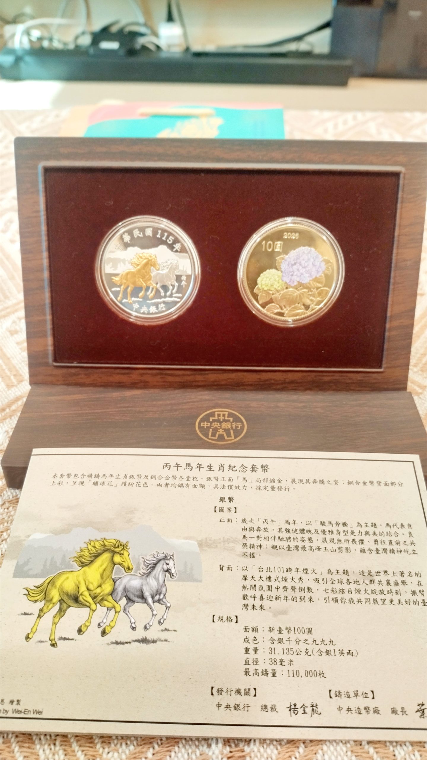Posted in 一般日誌 馬年紀念幣 Author: 蔡玉貴(friber) Published Date: 2026 年 2 月 4 日 網路預購丙午馬年生肖紀念套幣,網路預購配售5萬套,據報導有6萬餘人登記,果然中籤率高,我也是其中之一。 中籤且完成繳費者,115年1月29日起1個月內,於臺灣銀行營業時間內,本人攜帶身分證正本,至中籤人申購時所選擇之本行營業單位指定櫃檯親自領取。 1/29當天天氣晴朗,溫暖冬陽,故決定騎車前往領取。來回不到1小時,以下是返家後實景拍攝的馬年套幣。 Author: 蔡玉貴(friber)