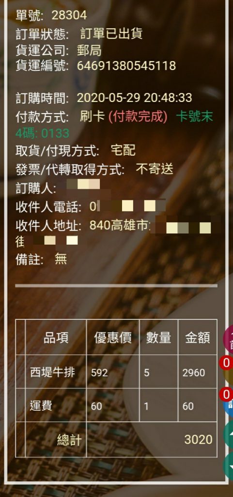 訂了餐券寄給高雄家人享用,我幾乎餐餐自煮,極少上餐廳用餐。