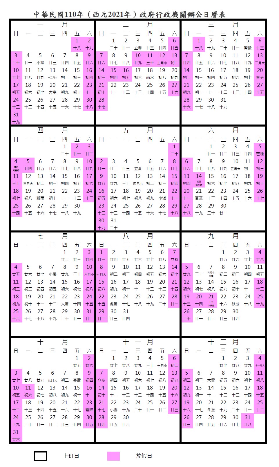 Posted in 一般日誌 中華民國110年政府行政機關辦公日曆表 Author: 蔡玉貴(friber) Published Date: 2020 年 6 月 10 日 中華民國110年政府行政機關辦公日曆表 中華民國110年政府行政機關辦公日曆表 Author: 蔡玉貴(friber)