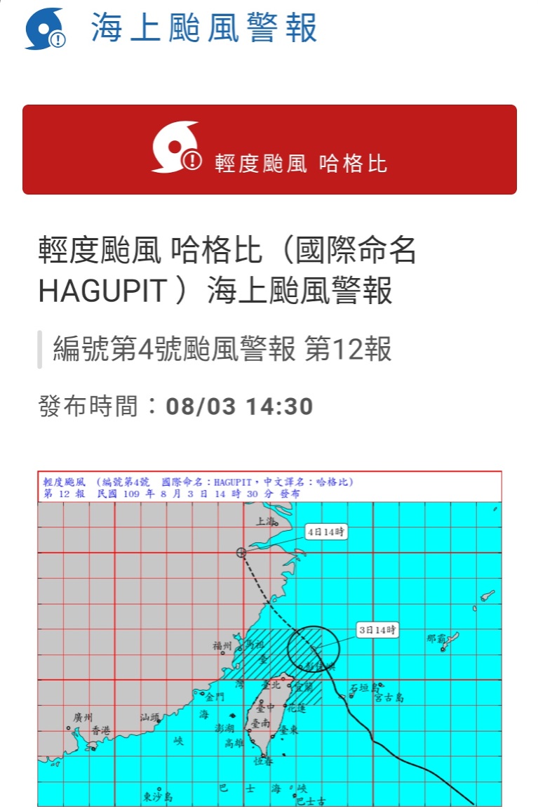 Posted in 一般日誌 八月發布的第一個颱風 Author: 蔡玉貴(friber) Published Date: 2020 年 8 月 3 日 八月發布的第一個颱風 輕度颱風-哈格比 (國際命名 HAGUPIT ) (海上颱風警報) 今日幾乎一整天都下雨,雨勢忽大忽小。 上個月2020年7月,是西北太平洋自1951年有紀錄以來,首次7月沒有颱風生成。也就是69年來第一次,7月沒有颱風生成,創下紀錄了。就我這個氣象外行者看來,這可不是好現象。氣候異常意味將來不可知的現象會越來越多。 因雨之故,打亂原先安排,待明日視天候再做決定。 圖片來源:中央氣象局 Author: 蔡玉貴(friber)