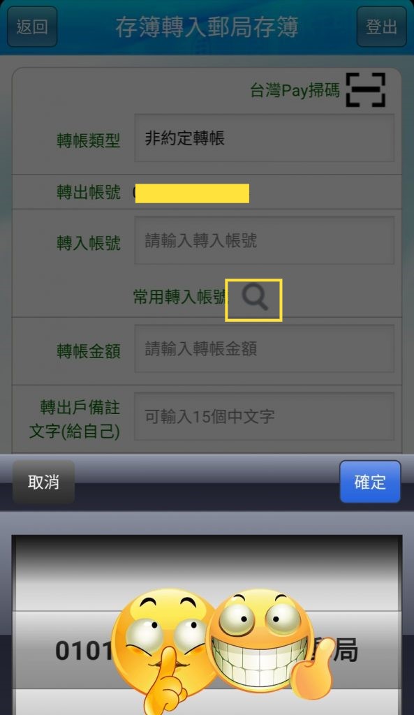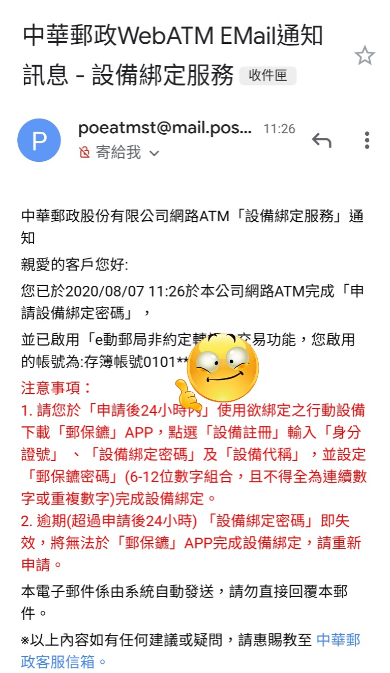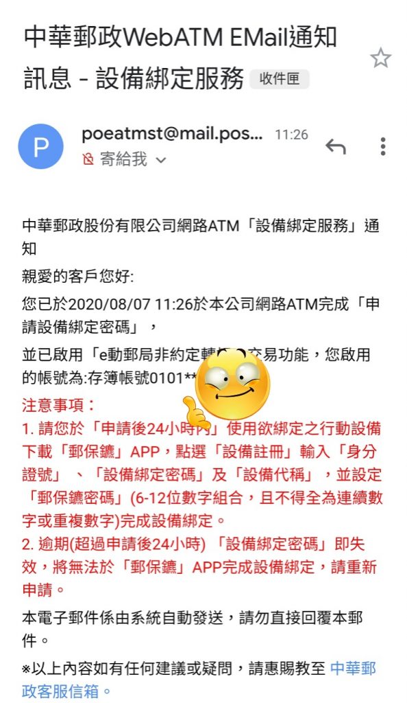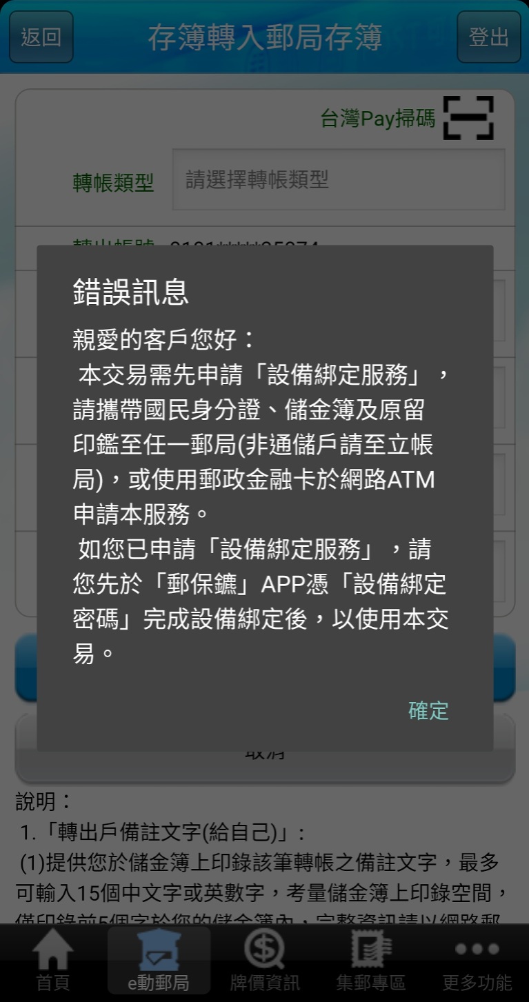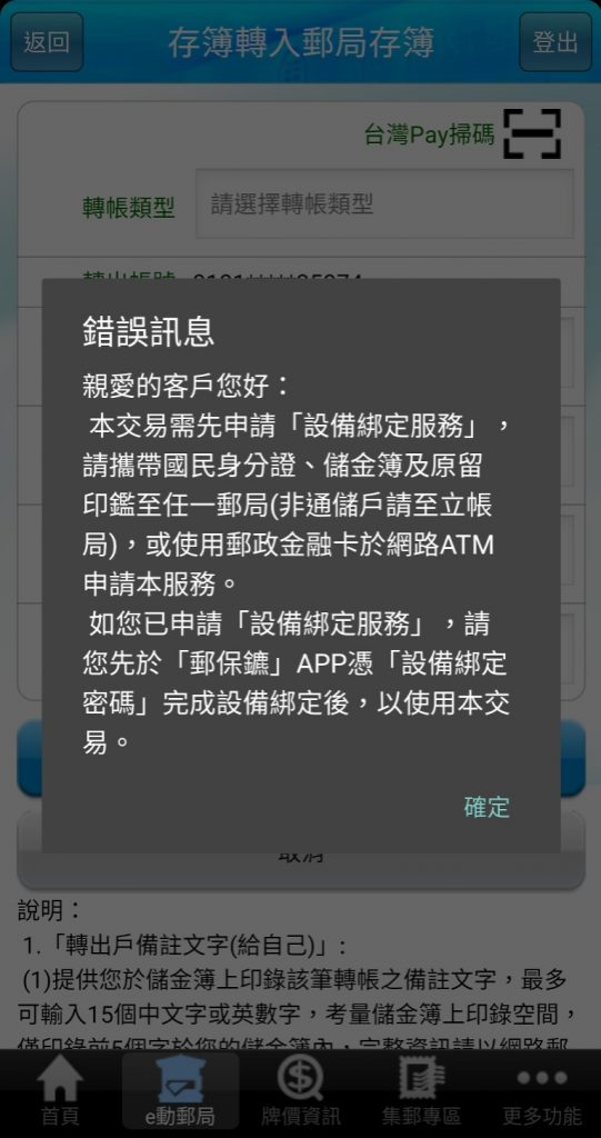 Posted in 一般日誌 使用郵局網路ATM辦理非約定帳號轉帳(須先辦理設備綁定服務) Author: 蔡玉貴(friber) Published Date: 2020 年 8 月 7 日 使用郵局網路ATM辦理非約定帳號轉帳(須先辦理設備綁定服務) 開啟e動郵局app,想用非約定帳號轉帳,出現如下訊息。 因此使用筆電與讀卡機登入郵局網路ATM 線上申辦「設備綁定服務」 申請過程會寄送簡訊至綁定的手機,大約等了1分鐘收到簡訊。 中華郵政發出Email通知已啟用 申辦後,必須在24小時內安裝郵保鑣app,並進行設定。 完成設定方能使用非約定帳號轉帳,事先設定「常用轉入帳號」會更便利。 Author: 蔡玉貴(friber)